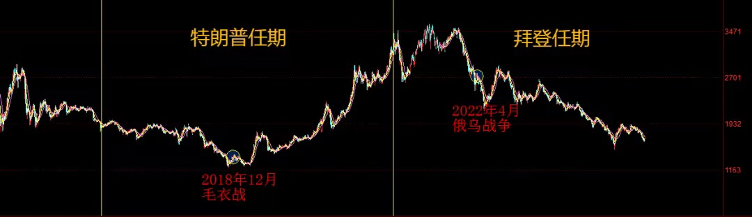 而拜登执政时期2021-2024,A股基本以下跌为主。