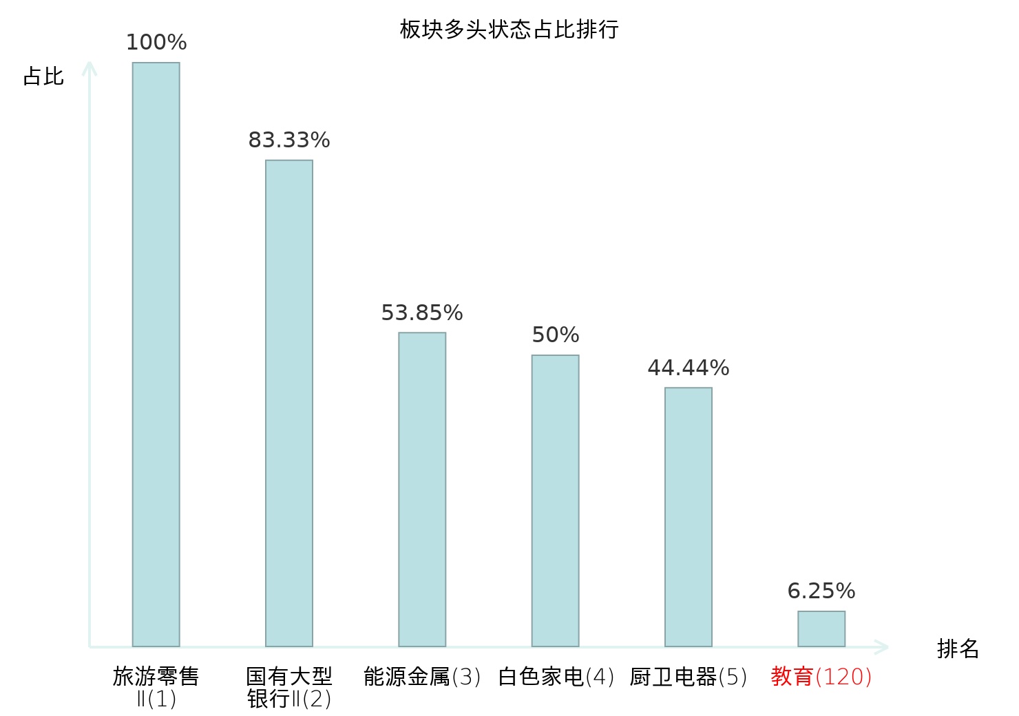全市场所有行业板块中主力多头状态占比排名中,旅游零售Ⅱ板块位居第一。地面兵装Ⅱ板块名次提升最快,较昨日上升71位。