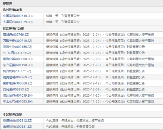 上证报中国证券网讯 12月15日,2家公司临停:中国高科、人福医药,2家公司复牌:恩捷股份、古鳌科技。