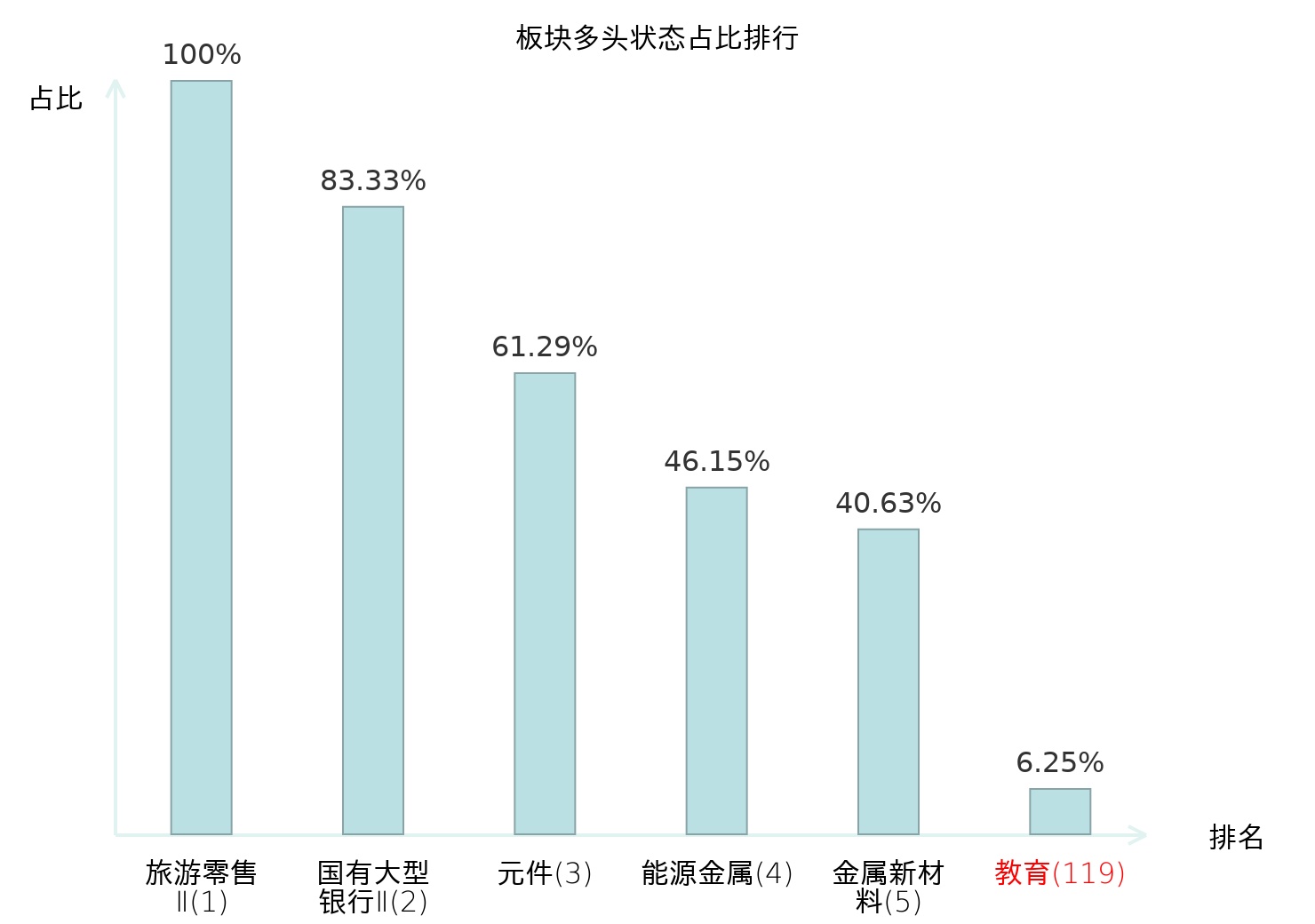 全市场所有行业板块中主力多头状态占比排名中,旅游零售Ⅱ板块位居第一。数字媒体板块名次提升最快,较昨日上升67位。