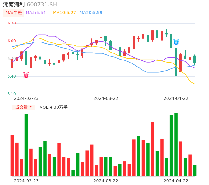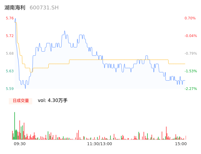 04月22日,湖南海利收报5.62,股价涨幅-1.75%,成交金额2431.36万元,换手率0.80%。