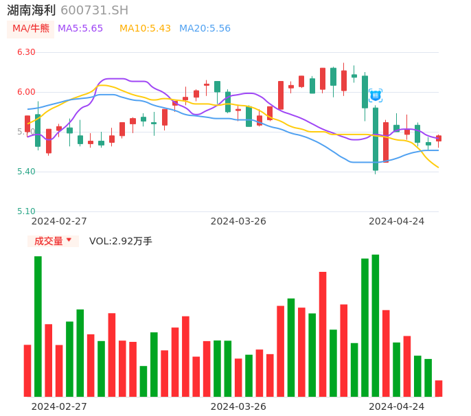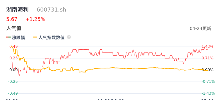04月24日,湖南海利收报5.67,股价涨幅1.25%,成交金额1645.37万元,换手率0.54%。
