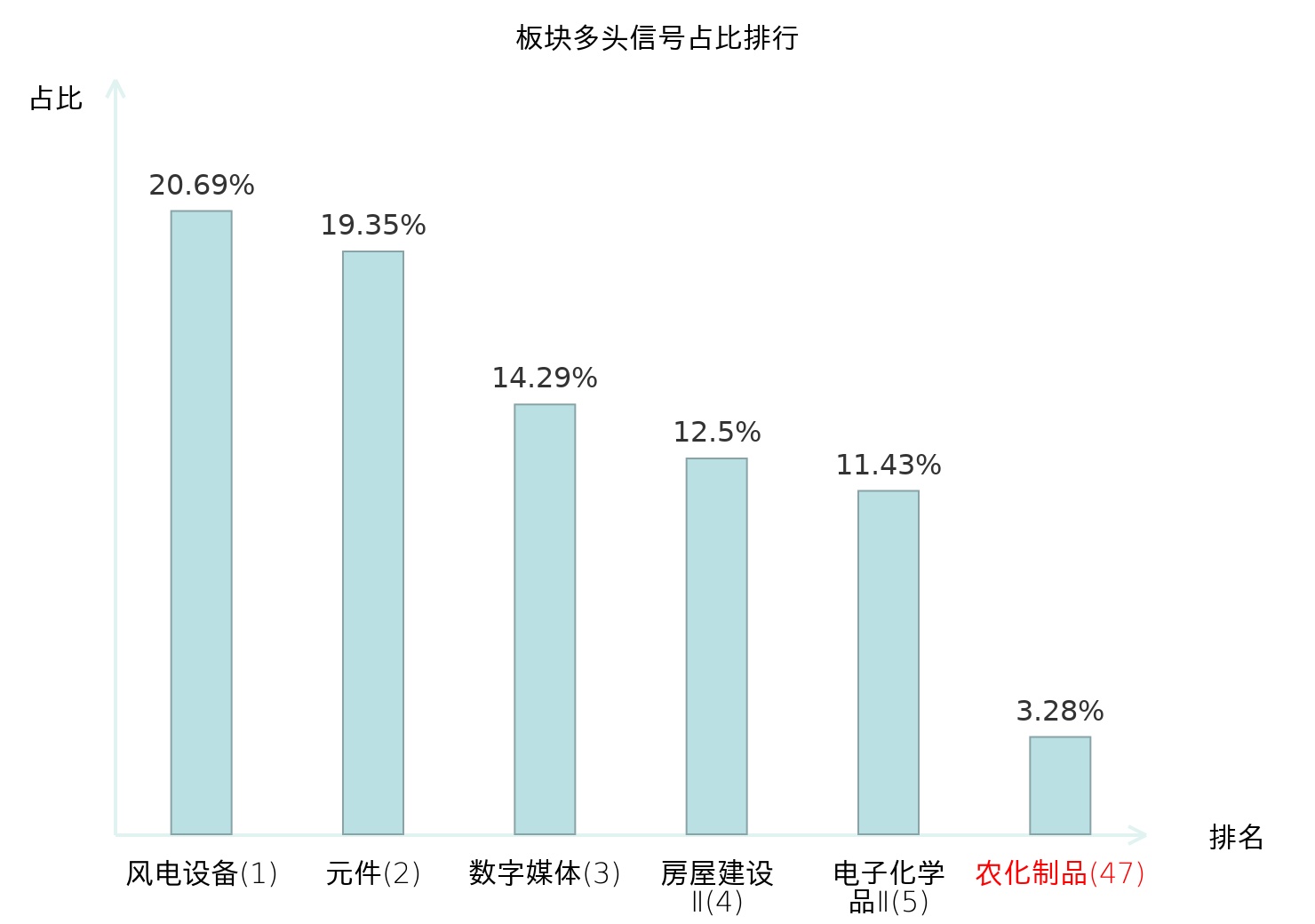 全市场所有行业板块中主力多头信号占比排名中,风电设备板块位居第一。房屋建设Ⅱ板块名次提升最快,较昨日上升116位。