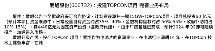 值得注意的是:2024年03月财通证券的张一弛分析师,首次发布关于爱旭股份的研究报告,标题为:爱旭股份(600732):投建TOPCON项目 完善业务布局。