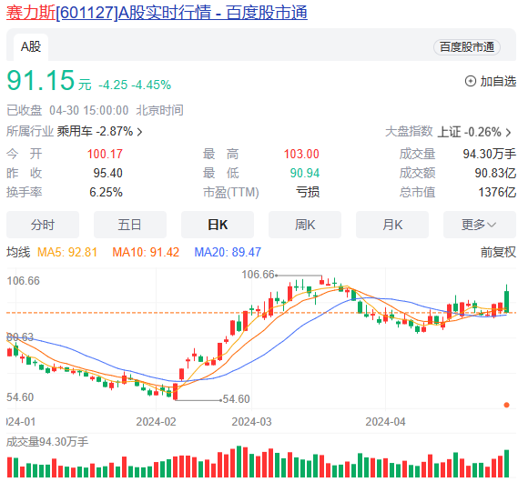 二级市场方面,赛力斯今年以来累计上涨19.62%,股价距离今年3月份创造的历史最高点仅有一步之遥。