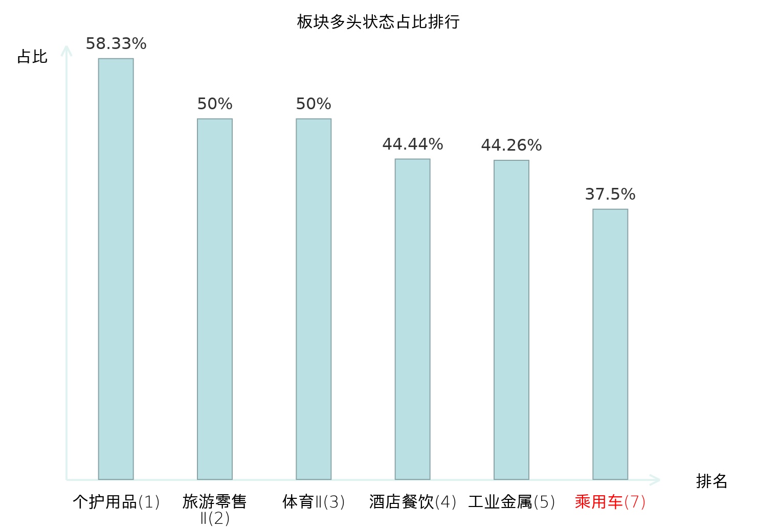 全市场所有行业板块中主力多头状态占比排名中,个护用品板块位居第一。非白酒板块名次提升最快,较昨日上升65位。