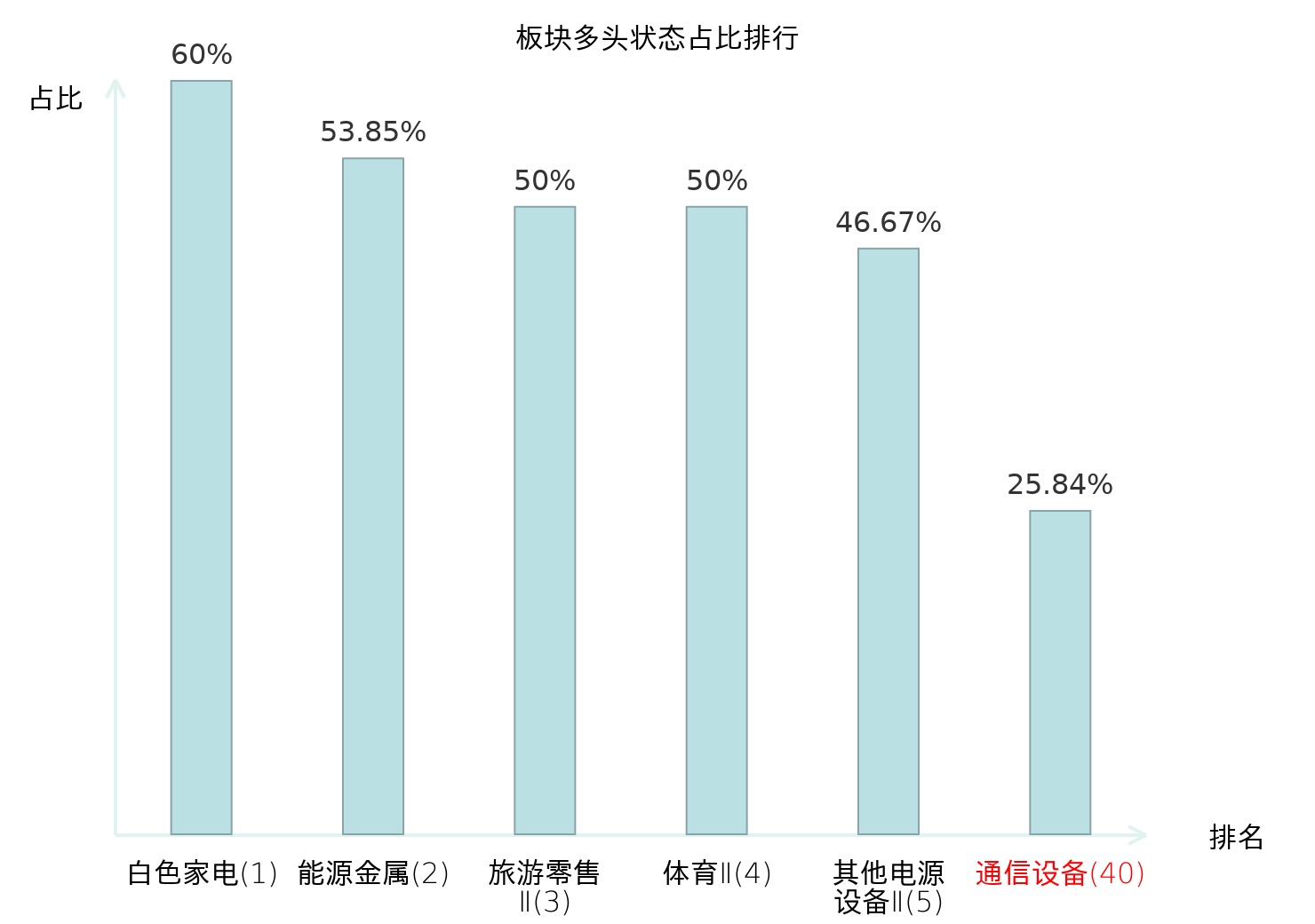 全市场所有行业板块中主力多头状态占比排名中,白色家电板块位居第一。体育Ⅱ板块名次提升最快,较昨日上升127位。