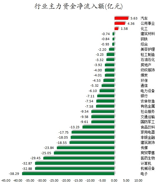 从行业来看,申万所属的31个一级行业,今日仅有汽车、公用事业、化工3个行业主力资金呈现净流入,净流入金额分别为5.63亿元、4.36亿元、1.58亿元。28个行业主力资金呈现净流出,其中,电子行业主力资金净流出最多,净流出金额为38.29亿元;行业主力资金净流出靠前的还有机械设备、计算机、医药生物、商贸零售、传媒等,净流出金额分别为32.88亿元、32.87亿元、29.45亿元、25.05亿元、23.84亿元。