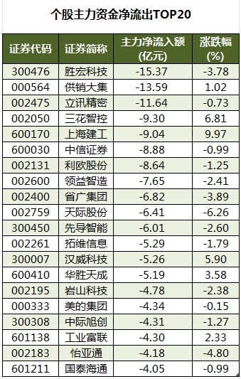 今日有3100只个股被主力资金净卖出,其中,147股被主力资金净卖出超1亿元。主力资金净流出最多的个股是胜宏科技,净流出金额为15.37亿元;主力资金净流出居前的个股还有供销大集、立讯精密、三花智控、上海建工、中信证券等,净流出金额分别为13.59亿元、11.64亿元、9.3亿元、9.04亿元、8.88亿元。