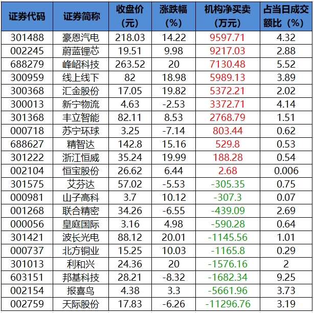 盘后龙虎榜数据显示,今日机构席位资金合计净买入约2.08亿元。其中,净买入的个股11只,净卖出的个股10只。机构净买入最多的股票是豪恩汽电,净买入金额约9597.71万元;机构净买入居前的还有蔚蓝锂芯、峰岹科技、线上线下等股。机构净卖出最多的股票是天际股份,净卖出金额约1.13亿元;机构净卖出居前的还有报喜鸟、邦基科技、利和兴等股。