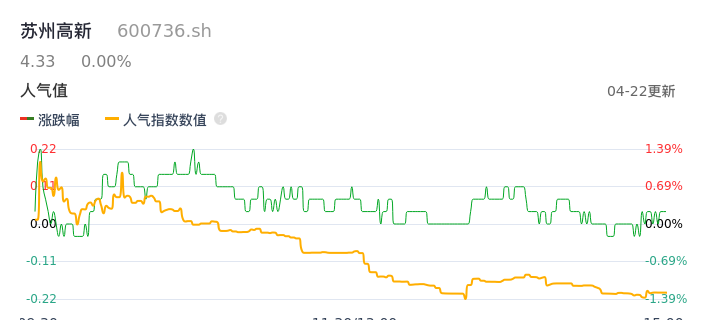 04月22日,苏州高新收报4.33,股价涨幅0.00%,成交金额1719.03万元,换手率0.34%。
