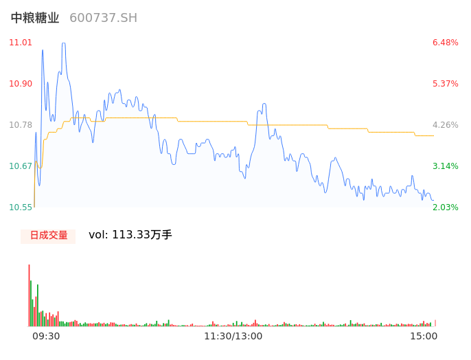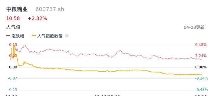 04月08日,中粮糖业收报10.58,股价涨幅2.32%,成交金额12.18亿元,换手率5.30%。