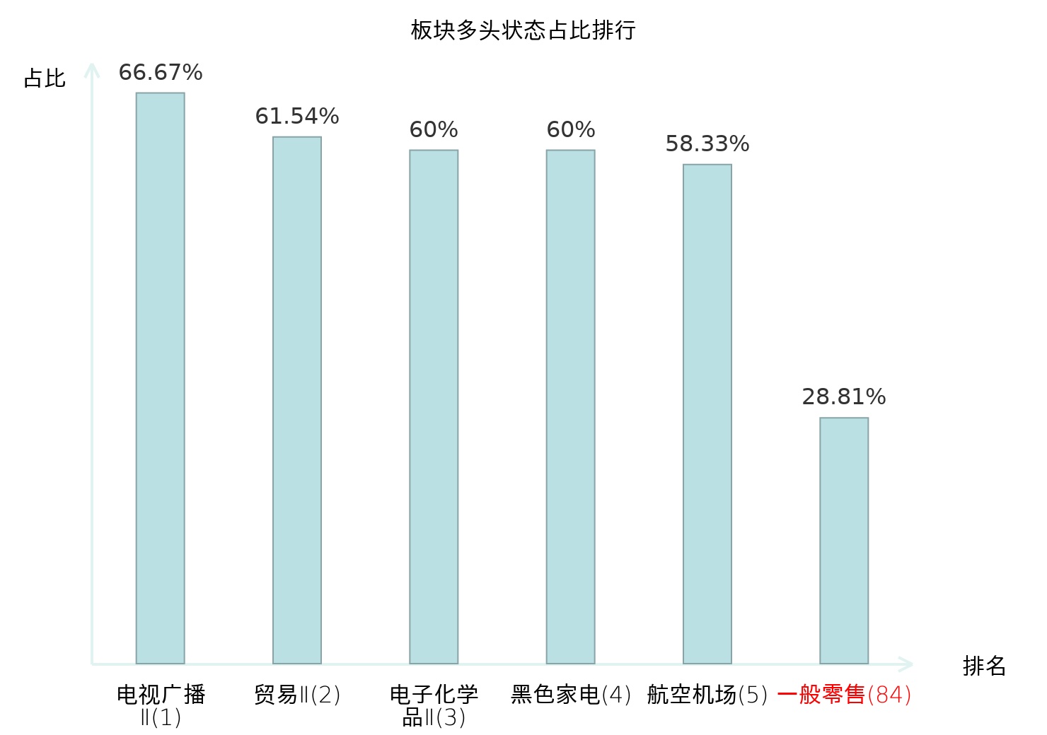 全市场所有行业板块中主力多头状态占比排名中,电视广播Ⅱ板块位居第一。黑色家电板块名次提升最快,较昨日上升80位。