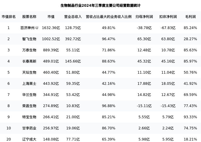 辽宁成大最新报告期数据为三季度,下表汇总了生物制品行业内市值靠前的公司三季度主要经营数据