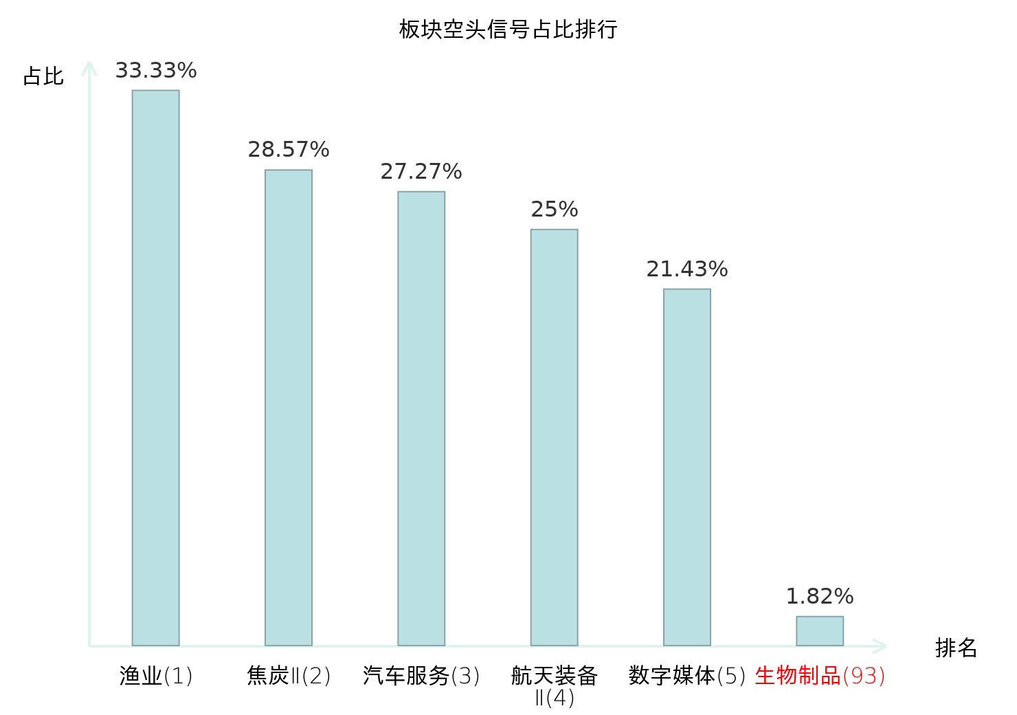 全市场所有行业板块中主力空头信号占比排名中,渔业板块位居第一。电子化学品Ⅱ板块名次提升最快,较昨日上升116位。