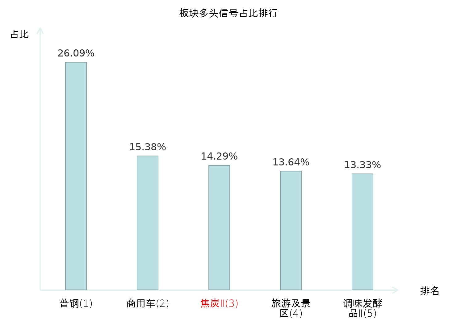 全市场所有行业板块中主力多头信号占比排名中,普钢板块位居第一。焦炭Ⅱ板块名次提升最快,较昨日上升119位。