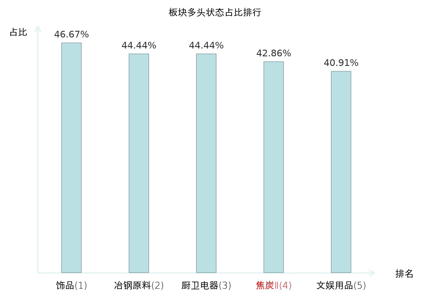 全市场所有行业板块中主力多头状态占比排名中,饰品板块位居第一。专业连锁Ⅱ板块名次提升最快,较昨日上升68位。