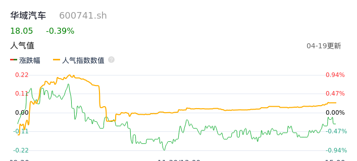 04月19日,华域汽车收报18.05,股价涨幅-0.39%,成交金额2.23亿元,换手率0.39%。