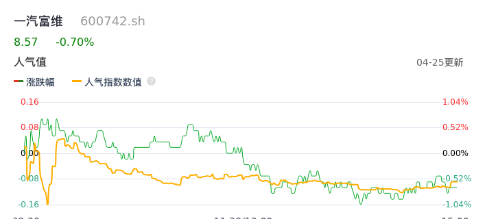 04月25日,一汽富维收报8.57,股价涨幅-0.70%,成交金额8606.00万元,换手率1.34%。