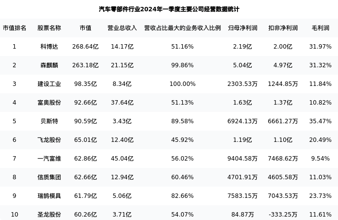 一汽富维最新报告期数据为一季度,下表汇总了汽车零部件行业内市值靠前的公司一季度主要经营数据