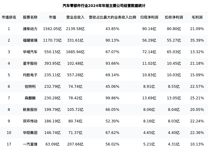一汽富维最新报告期数据为年报,下表汇总了汽车零部件行业内市值靠前的公司年报主要经营数据