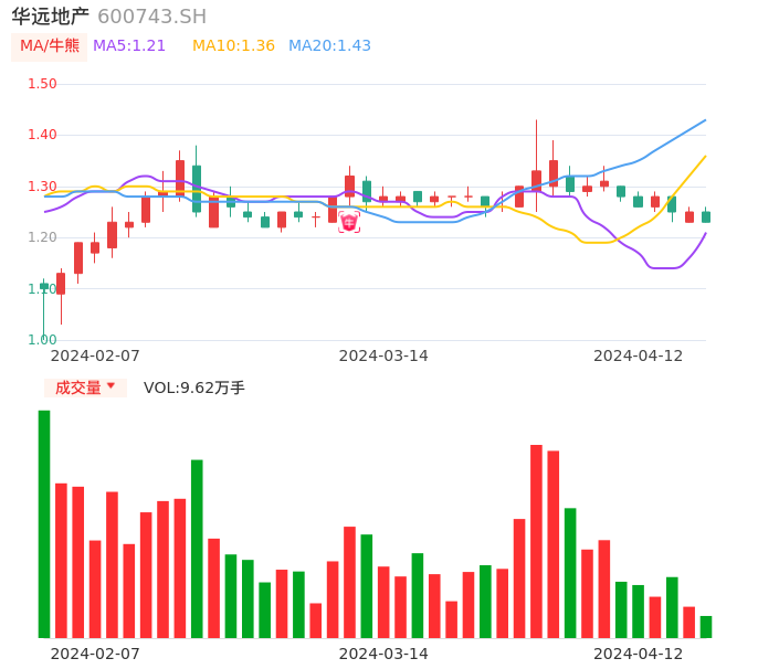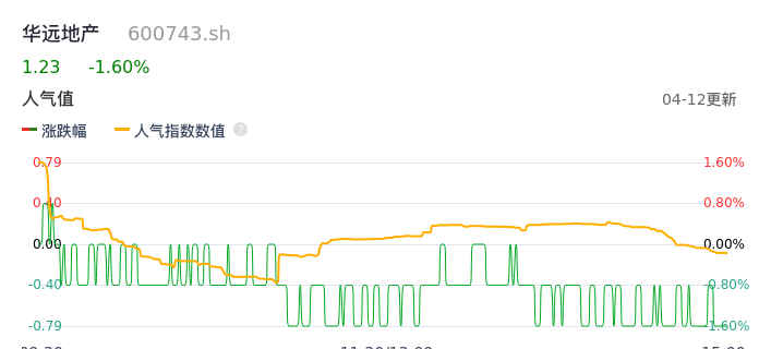 04月12日,华远地产收报1.23,股价涨幅-1.60%,成交金额1191.17万元,换手率0.41%。