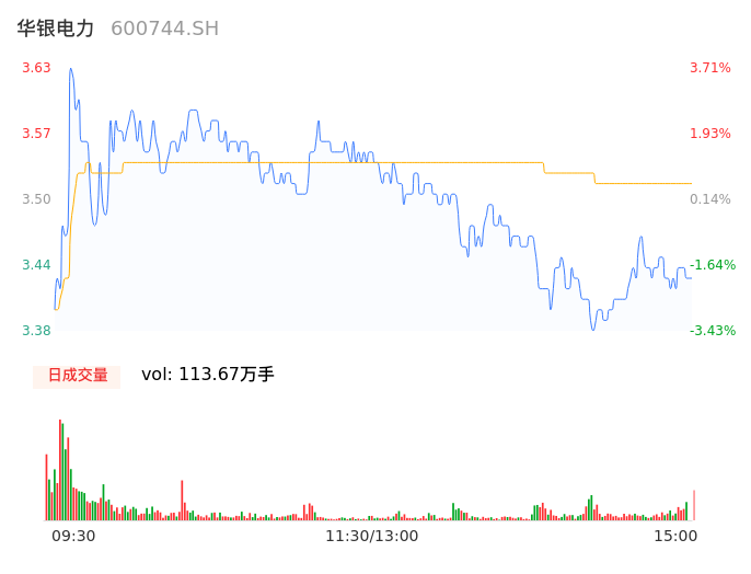 04月15日,华银电力收报3.44,股价涨幅-1.71%,成交金额3.99亿元,换手率5.60%。