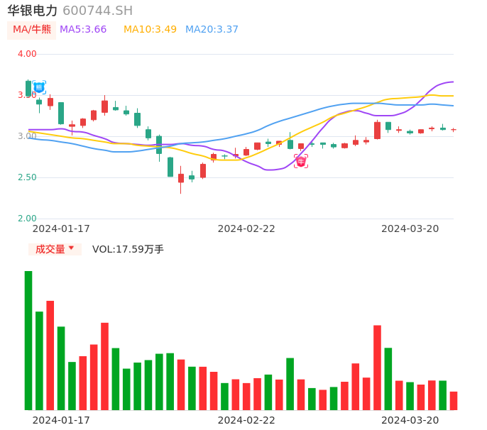 03月20日,华银电力收报3.08,股价涨幅0.00%,成交金额5411.80万元,换手率0.87%。