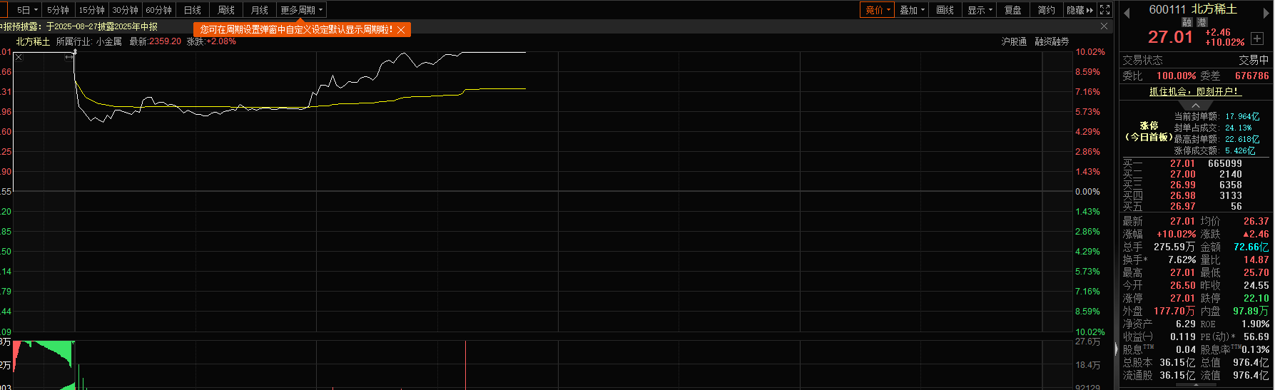 该股今日盘中成功涨停,截至发稿,股价为27.01元/股,市值为976.4亿元,涨停板封单超60万手。