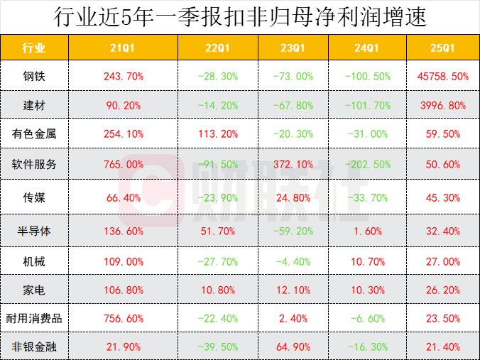 此外,钢铁、建材扣非归母净利润同比大幅提升,结束此前下滑趋势,有色金属、软件服务增速超50%,传媒行业扣非净利增速创近五年单季度新高。