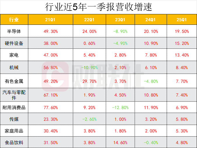 从行业的一季报来看,A股行业营收增速呈结构性分化:半导体、硬件设备等维持高增,国防军工、煤炭、纺织服装同比降幅超15%。历史对比显示,半导体连续两年增速超15%,家电、机械较2024年显著回升,国防军工、煤炭跌至近五年最低水平。