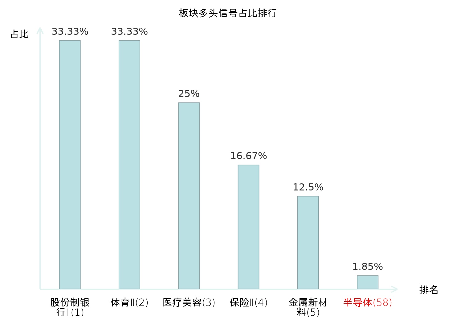 全市场所有行业板块中主力多头信号占比排名中,股份制银行Ⅱ板块位居第一。体育Ⅱ板块名次提升最快,较昨日上升128位。