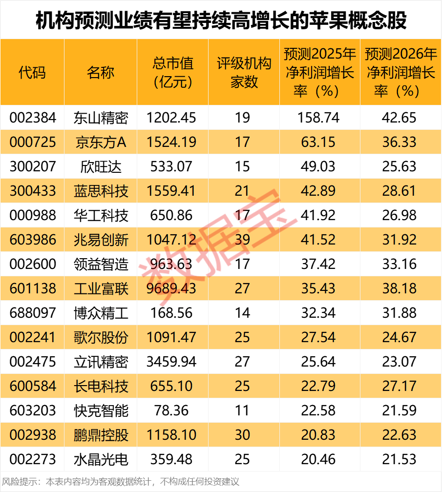 业绩预期方面,获10家以上机构给予评级的苹果概念股中,有15只概念股2025~2026年业绩有望持续超20%增长,东山精密是苹果公司的重要供应商,为其提供柔性印刷电路板(FPC)等产品,机构预测2025年和2026年东山精密的净利润增幅分别为158.74%和42.65%。