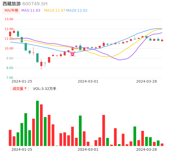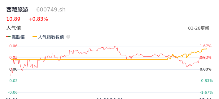 03月28日,西藏旅游收报10.89,股价涨幅0.83%,成交金额3614.19万元,换手率1.46%。