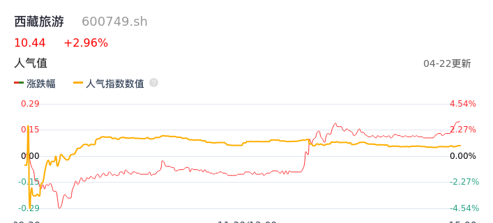 04月22日,西藏旅游收报10.44,股价涨幅2.96%,成交金额7252.21万元,换手率3.16%。