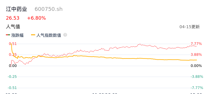 04月15日,江中药业收报26.53,股价涨幅6.80%,成交金额4.06亿元,换手率2.50%。
