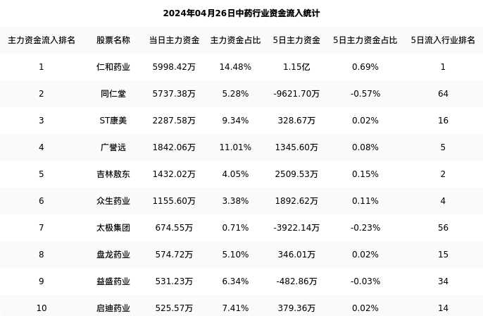 下表为今日行业内流入前10股票的信息