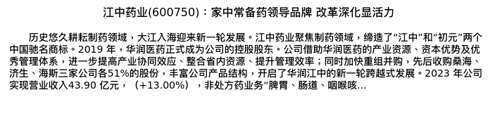 值得注意的是:2024年04月海通证券的余文心/郑琴/彭娉分析师,首次发布关于江中药业的研究报告,标题为:江中药业(600750):家中常备药领导品牌 改革深化显活力。