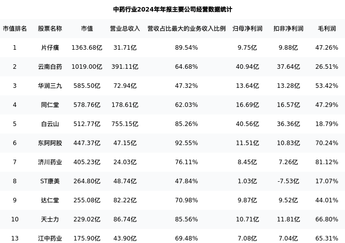 江中药业最新报告期数据为年报,下表汇总了中药行业内市值靠前的公司年报主要经营数据