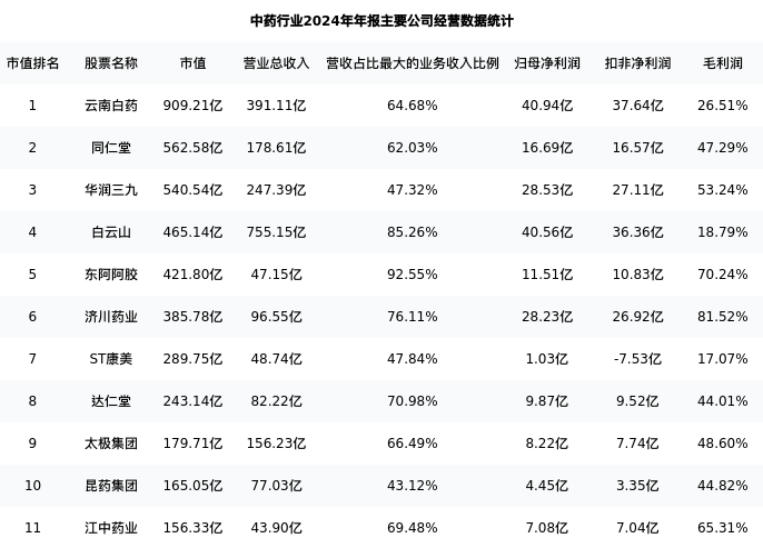 江中药业最新报告期数据为年报,下表汇总了中药行业内市值靠前的公司年报主要经营数据