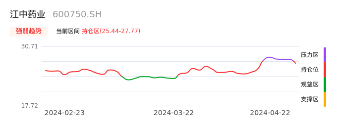 我们来看一下该股的九方特色指标强弱趋势的情况:江中药业近日从压力区回到持仓区。股价快速拉升后出现持续调整。后续主要关注下方支撑位:25.44元是否能启稳回升。