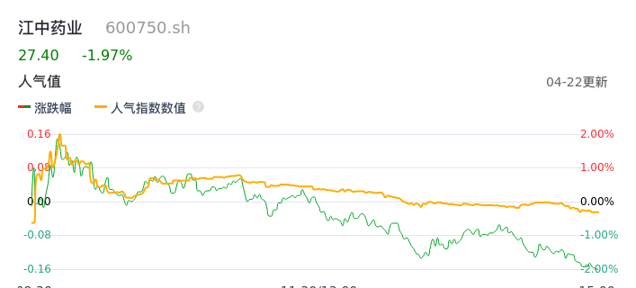 04月22日,江中药业收报27.40,股价涨幅-1.97%,成交金额3.61亿元,换手率2.07%。