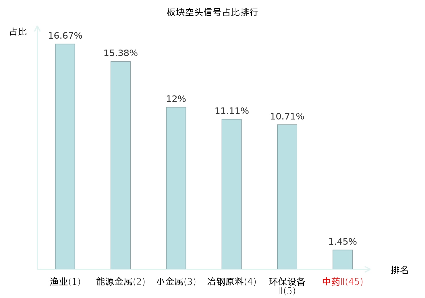 全市场所有行业板块中主力空头信号占比排名中,渔业板块位居第一。调味发酵品Ⅱ板块名次提升最快,较昨日上升106位。