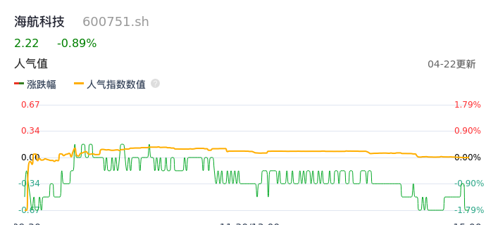 04月22日,海航科技收报2.22,股价涨幅-0.89%,成交金额3728.30万元,换手率0.65%。