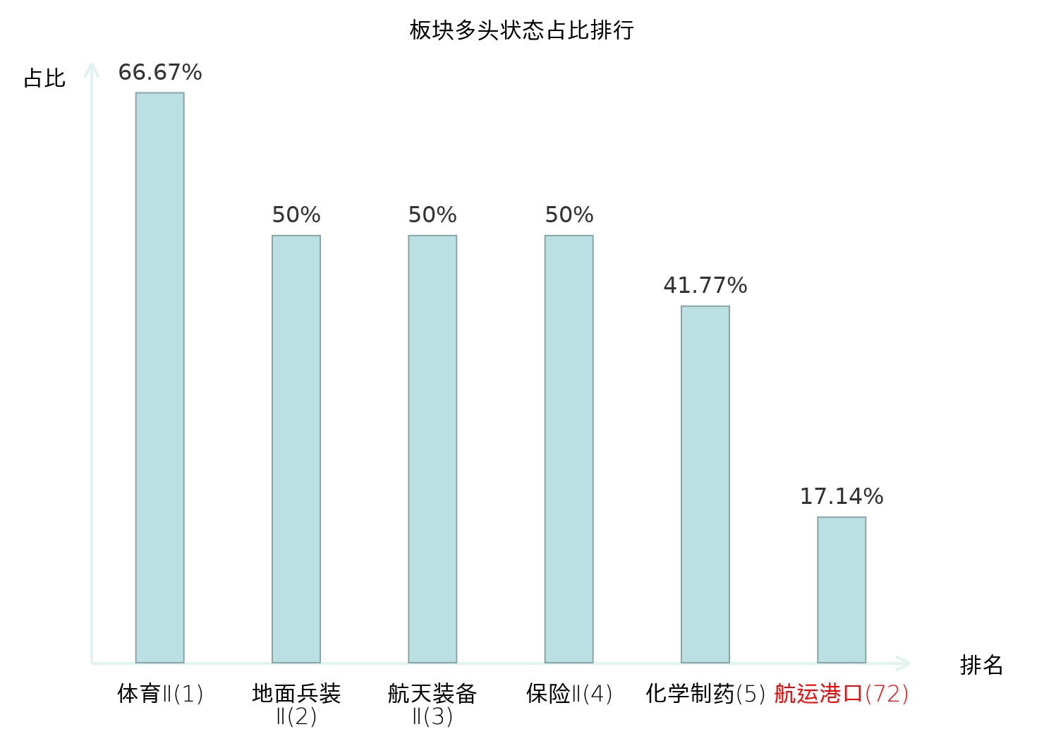 全市场所有行业板块中主力多头状态占比排名中,体育Ⅱ板块位居第一。普钢板块名次提升最快,较昨日上升98位。