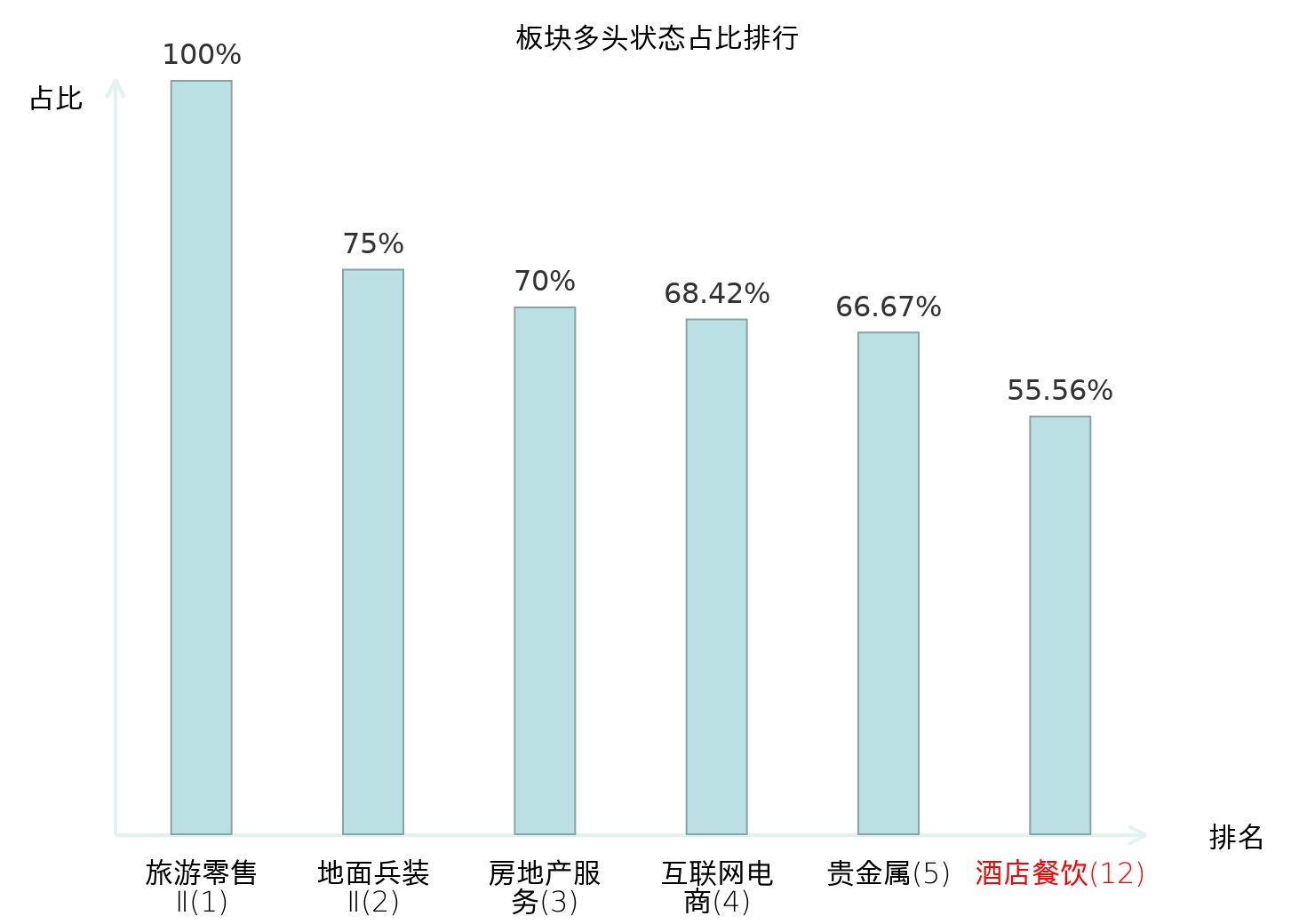 全市场所有行业板块中主力多头状态占比排名中,旅游零售Ⅱ板块位居第一。白色家电板块名次提升最快,较昨日上升65位。