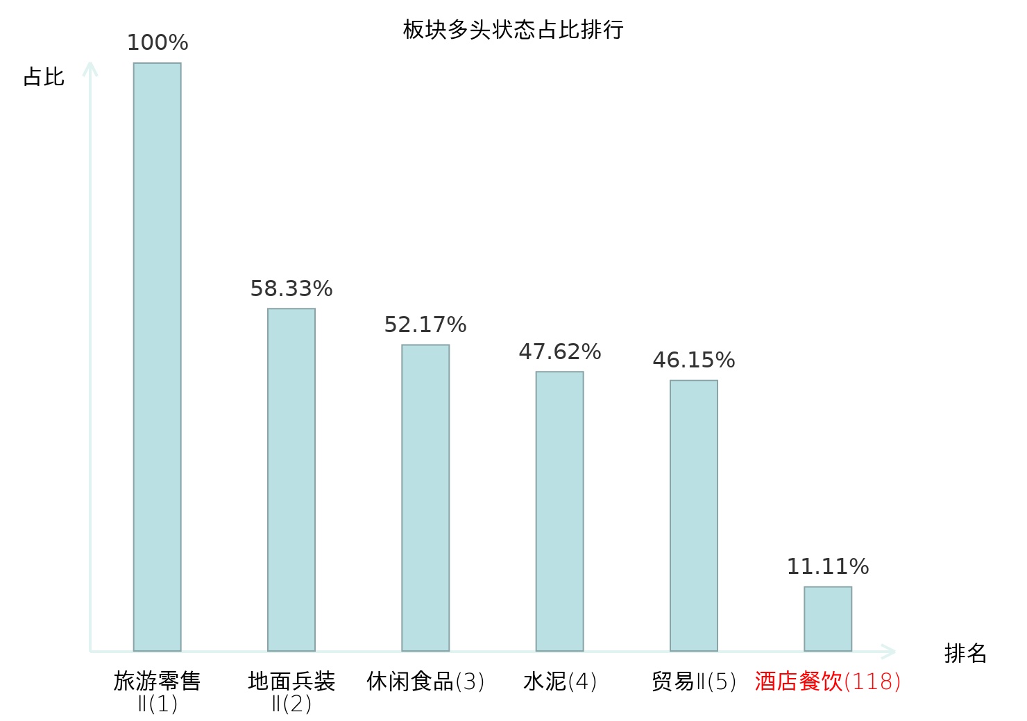 全市场所有行业板块中主力多头状态占比排名中,旅游零售Ⅱ板块位居第一。焦炭Ⅱ板块名次提升最快,较昨日上升82位。