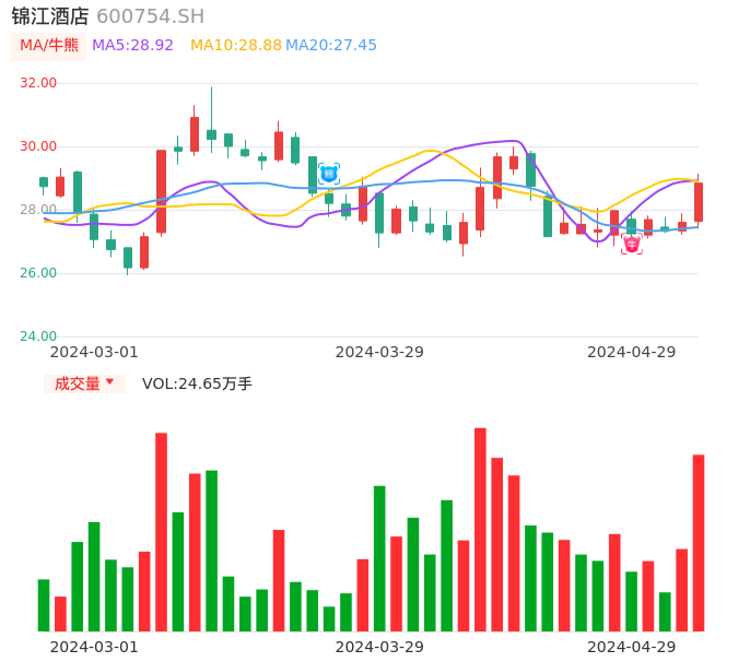 04月29日,锦江酒店收报28.84,股价涨幅4.49%,成交金额7.02亿元,换手率2.70%。