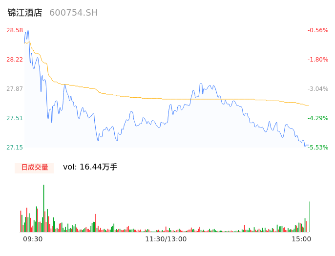 04月16日,锦江酒店收报27.15,股价涨幅-5.53%,成交金额4.54亿元,换手率1.80%。
