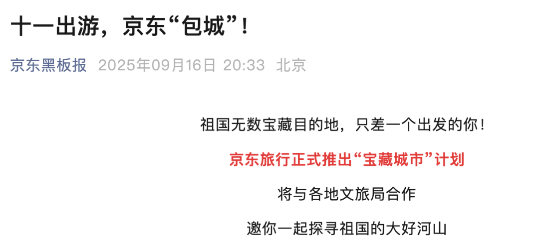 同日晚间,据京东黑板报消息,国庆假期在即,京东旅行宣布正式启动“宝藏城市”计划,定期与全国各地文旅局开展深度战略合作。京东旅行相关负责人表示:“我们希望把京东最有优势的供应链与各地文旅产业深度融合,创新文旅消费场景,优化旅游消费体验,为地方经济发展注入新活力。”
